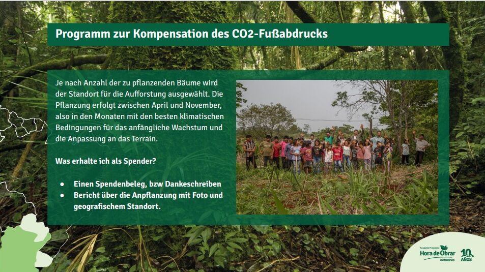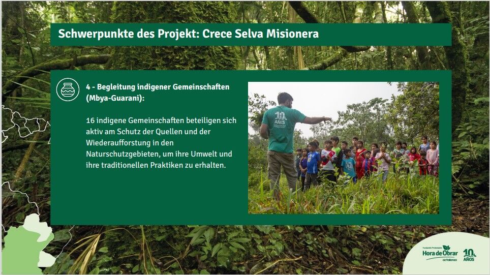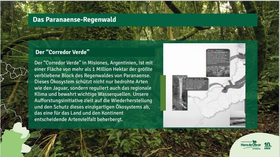 Das Aufforstungsprojekt “Hora de obrar = Zeit zu Handeln” in Argentinien ist doppelt so groß wie das Oldenburger Land und größter Block des zu 98% vernichteten, artenreichen atlantischen Regenwaldes. Dieses einzigartige Ökosystem schützt viele bedrohte Arten, reguliert regionales Klima und bewahrt wichtige Wasserquellen. So wird die Klimaresilienz und Regeneration des Ökosystems gestärkt.