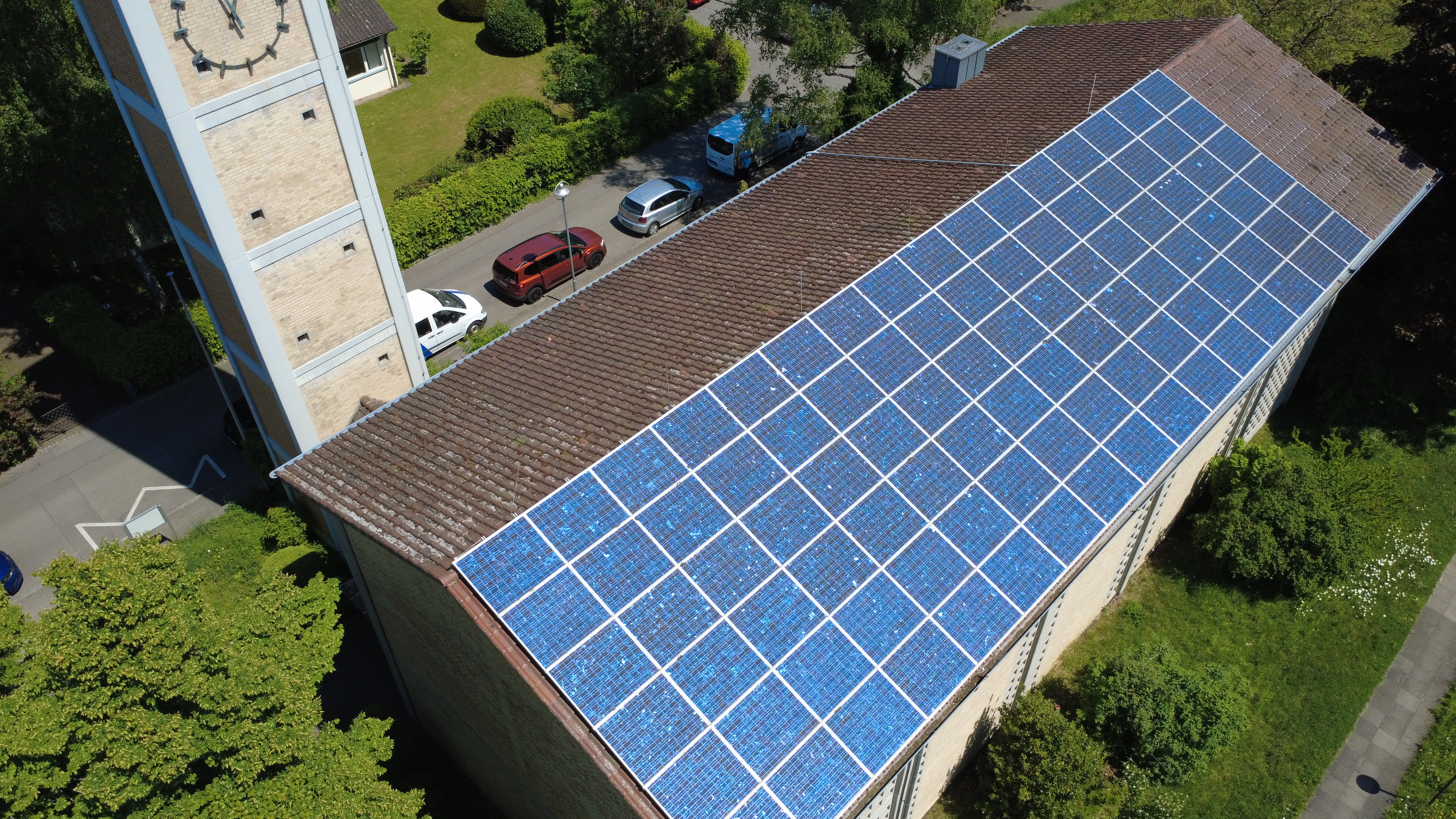 Das noch mit den gespendeten Solarpanelen versehene Dach der Konstanzer Kreuzkirche