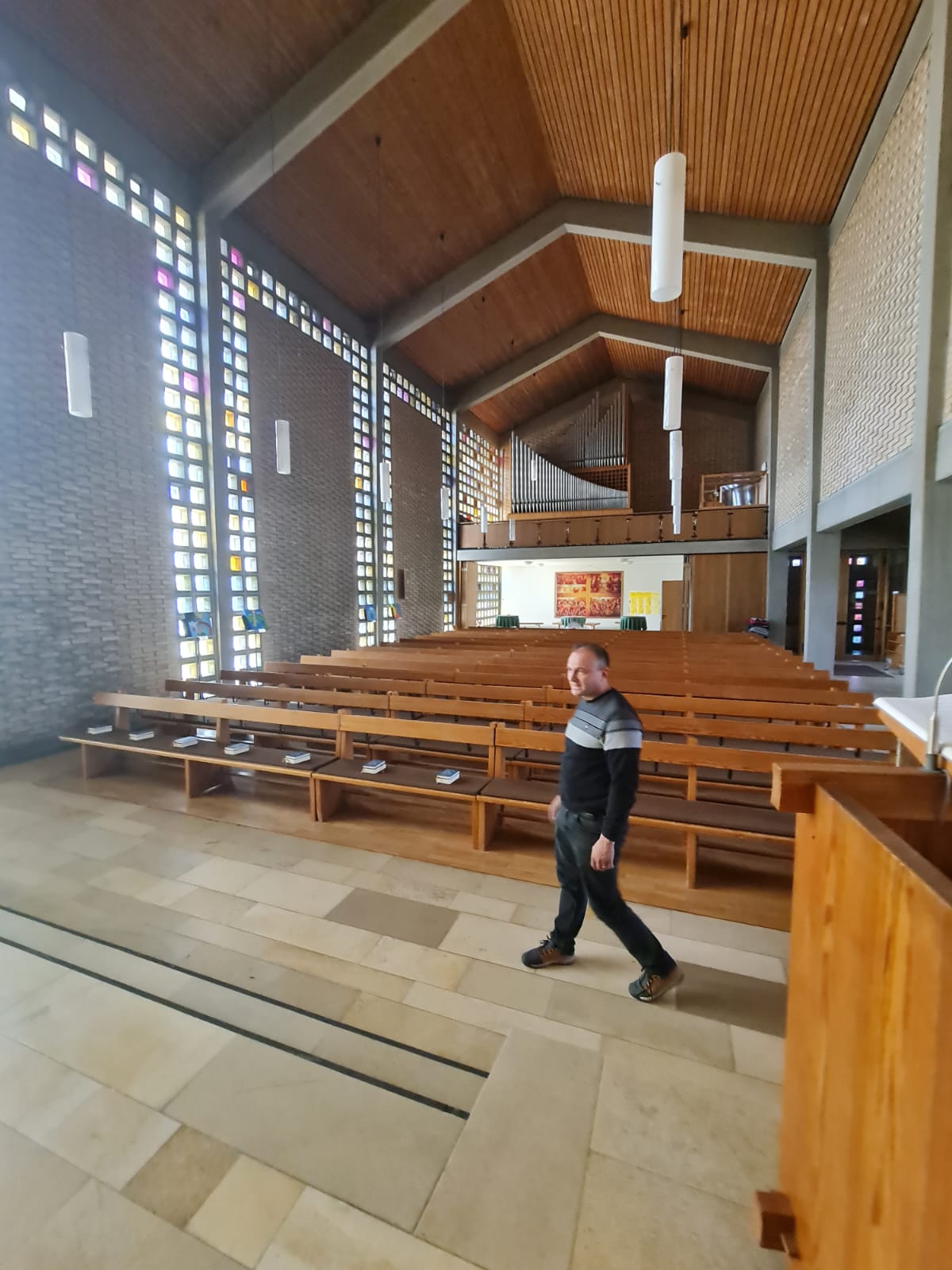 Pfarrer Péter Szeghljánik besichtigt den großen Innenraum der Allmannsdorfer Kreuzkirche, die im April 1957 eingeweiht wurde. -