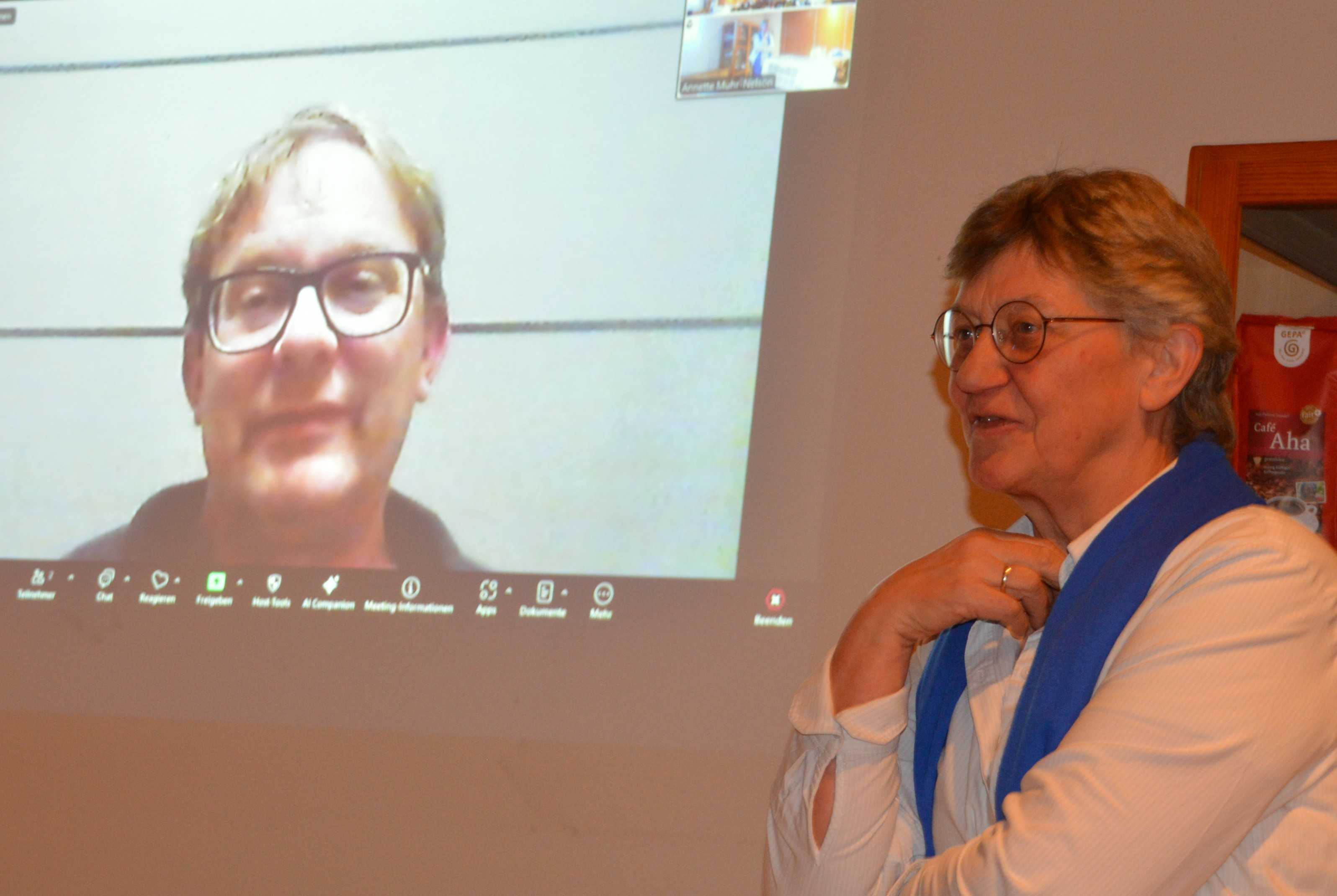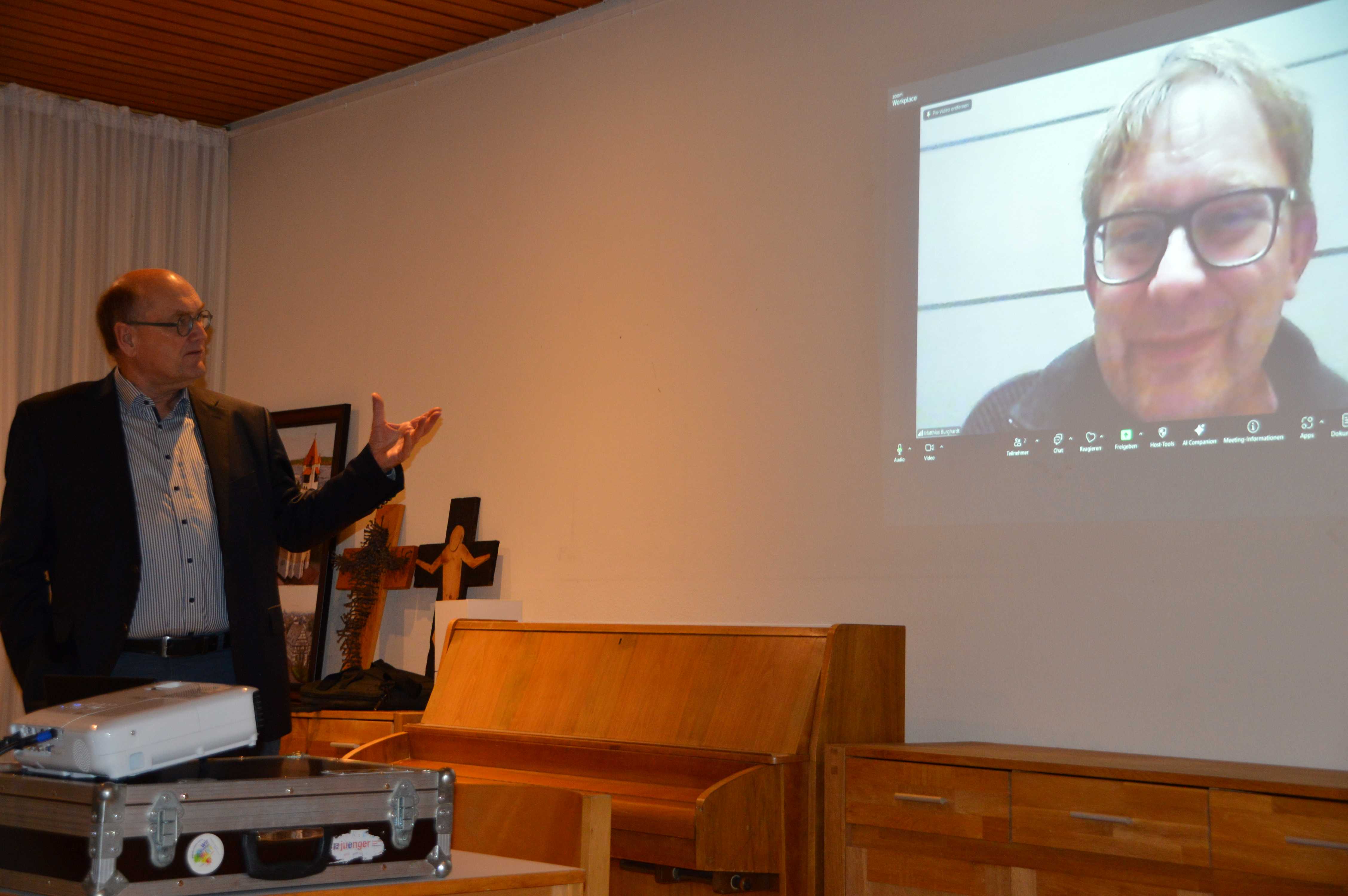 Dass durch hybride Kriegsführung die Grenzen zwischen Krieg und Frieden verschwimmen und offene, demokratische Gesellschaften mit ihren langen und schwerfälligen Entscheidungswegen besonders gefährdet sind, machte anschließend der online zugeschaltete Matthias Burghardt mit seinem sehr lebendigen Bericht deutlich. Der gebürtige Ingelheimer wuchs in Niedersachsen auf, machte dort seinen Wehrdienst und studierte Theologie. Seit 2006 ist er Pfarrer der deutschsprachigen Gemeinden in Estland. Seine Frau Anne ist Estin und ebenfalls Pfarrerin. In dem kleinen Land mit sowjetrussischer Vergangenheit sei die hybride Kriegsführung des aggressiven Nachbarn Russland nicht mehr ‚womöglich real‘ wie in Deutschland, sondern ‚tatsächlich real‘. Trotzdem bleibe die Bevölkerung gelassen angesichts der ständigen Drohnenflüge, Bombendrohungen, digitalen Störungen und der Verbreitung von Unwahrheiten durch russische Propaganda. Mit einem frontalen Angriff Russlands rechne er jedoch nicht. Die Russen setzten eher auf massive Verunsicherung. Diese zeige bei den beiden anderen baltischen Staaten und in Westeuropa stärkere Wirkung als in Estland, wo man sich sehr über den Beitritt der großen Nachbarn Schweden und Finnland zur Nato freue; zudem vertraue man den Behörden und wappne sich auch militärisch. Es gebe eine vergleichsweise starke Freiwilligen-Armee – in der Hoffnung, dass ihr Einsatz nie nötig sei. „Mein Traum vom Frieden ist, dass es zwischen Russen und Ukrainern, zwischen Russen und Esten eines Tages so wird, wie es heute zwischen Deutschen und Dänen oder Deutschen und Franzosen ist. Da war echter Friede in früheren Zeiten auch undenkbar“, fasste Burghardt seine Überlegungen zusammen. Dem konnten alle Teilnehmenden nur vollen Herzens zustimmen.