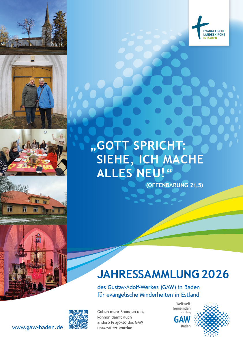 Die Jahressammlung wird am Freitag, 20. März 2026 um 18:00 Uhr in der evangelischen Gustav-Adolf-Kirche, Hebelstraße 2, 76669 Bad Schönborn eröffnet. Wie viele Gemeinden in Baden, ist die dortige Kirchengemeinde nicht nur über den Namen ihrer Kirche, sondern auch in ihrer Entstehungszeit und über ihr gegenwärtiges Gemeindeleben mit dem Gustav-Adolf-Werk verbunden. Herzliche Einladung!