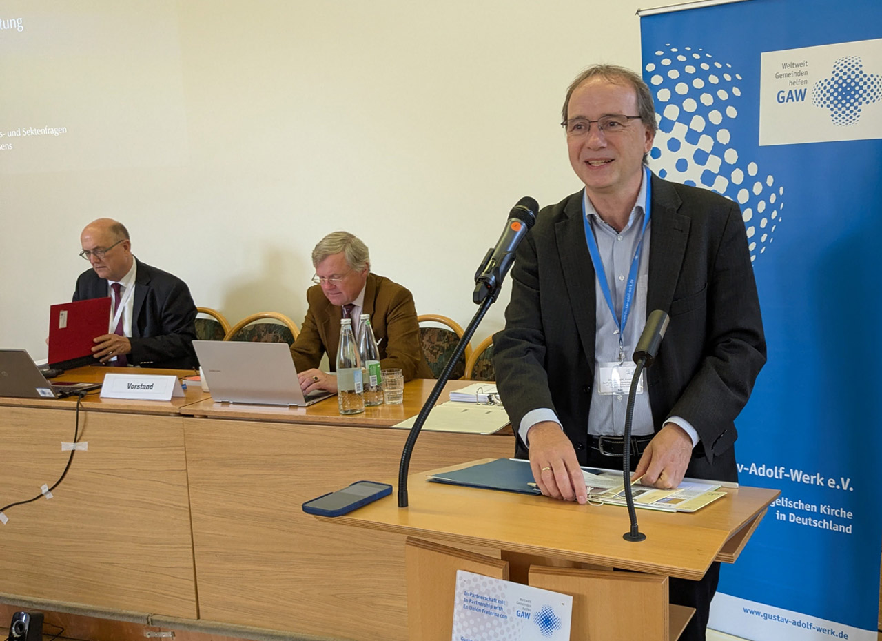 Den thematischen Schwerpunkt der Tagung bildete der Vortrag von Harald Lamprecht, Beauftragter für Weltanschauungs- und Sektenfragen der Evangelisch-Lutherischen Landeskirche in Sachsen. Lamprecht, der sich vor allem auf den Rechtspopulismus konzentrierte, zeigte auf, warum dieser im Widerspruch zum christlichen Menschenbild steht. Er analysierte die Strategien der Populisten, die den natürlichen Egoismus und kurzfristiges Denken gegen Nächstenliebe und Nachhaltigkeit ausspielen, um gesellschaftliche Grundsatzprobleme wie die extrem ungleiche Vermögensverteilung zu verschleiern. Sein Vortrag wurde durch Gäste der Delegiertenversammlung ergänzt: Ingrid Monjencs (Evangelische Kirche A.B. in Österreich), Stephanie Gysel (Protestantisch-kirchlicher Hilfsverein des Kantons Zürich, Schweiz) und Jean-Louis Stilmant (Vereinigte Protestantische Kirche in Belgien) gaben aufschlussreiche Einblicke in die Situationen in ihren jeweiligen Ländern und Kirchen.
