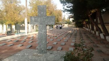 Nach der Besichtigung des Chan-Palasts in Kokand haben wir als letzte gemeinsame Unternehmung unserer Reise den italienisch-deutschen Soldatenfriedhof besucht, der ebenfalls in Kokand liegt. Dieser Friedhof ist der einzige deutsche Soldatenfriedhof in Usbekistan, hier liegen Gefangene insbesondere der Schlacht um Stalingrad. Die jüngsten Begrabenen sind gerade einmal 19 Jahre alt geworden. Jeweils zum Volkstrauertag kommt der deutsche Botschafter hierher zu einer Gedenkeier.