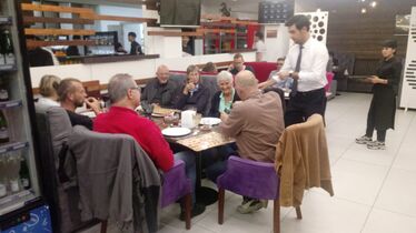Nach langer Reise sind wir im schließlich Hotel angekommen. Man hatte uns nämlich zunächst in eine anderes Hotel gefahren. Gleich haben wir unsere Zimmer bezogen und gehen erst mal hinaus. Wir haben natürlich Hunger, und hoffen ein noch geöffnetes Restaurant zu finden. Und gleich neben dem Hotel werden wir in einem Türkischen Restaurant bewirtet.