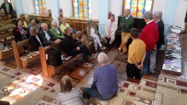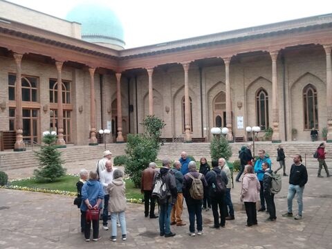 Nach dem morgendlichen Gemeindegottesdienst beantwortet die Taschkenter Predigerin Ludmilla Schmidt die Fragen unserer Reisegruppe zu Vergangenheit und Gegenwart der lutherischen Gemeinde in Taschkent und ihrer Kirche. Danach gab es Plov (Pilav) für alle . Bei dieser Gelegenheit kommt es zu einen regen Austausch zwischen Einheimischen und Gästen. Im Anschluss besuchen wir die Rakat-Moschee und sprechen mit zwei Imanen, die uns Christen mit "liebe Freunde" anreden.